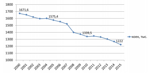 Согласно данным Росстата, число больничных организаций в России сократилось с 2000 по 2015 год в два раза – с 10,7 до 5,4 тысячи. При этом оптимизация и расширение действующих ЛПУ не компенсировали существенное сокращение числа больничных коек за этот период – с 1671,6 до 1222 тысяч мест.