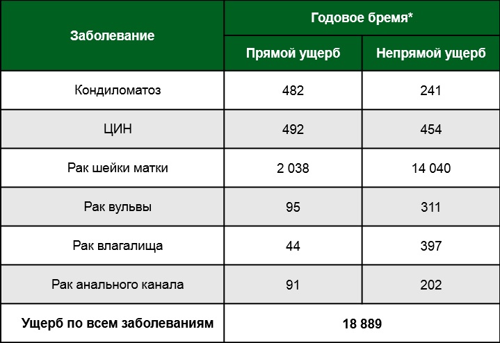 Наибольший урон от заболеваний, ассоциированных с ВПЧ, наносит рак шейки матки. Годовое бремя от этого заболевания в виде прямых и непрямых затрат эксперты оценили в 16 млрд рублей. Ежегодное бремя госпитальных случаев от острых кишечных инфекций, вызванных ротавирусной инфекцией, оценено в 3,6 млрд рублей.