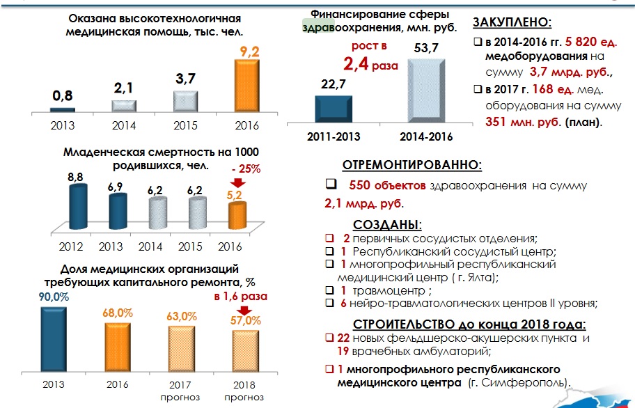 На полуострове созданы 2 первичных сосудистых отделения, Республиканский сосудистый центр, многопрофильный республиканский медицинский центр в Ялте, 1 травмоцентр, 6 нейро-травматологических центров II уровня. До конца 2018 года запланировано строительство 22 фельдшерско-акушерских пунктов и 19 врачебных амбулаторий, а также многопрофильного республиканского медицинского центра в Симферополе.