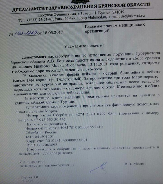 На заседании регионального отделения «Единой России» было принято решение помочь в сборе средств, и партийцы внесли в копилку порядка 2,5 млн рублей. Губернатор Брянской области Александр Богомаз бросил клич и чиновникам. Однако подчиненные поняли его весьма своеобразно. И.о. директора Департамента здравоохранения Виталий Мосин выпустил официальное письмо, адресованное главным врачам ЛПУ с призывом «оказать содействие в сборе средств на лечение».