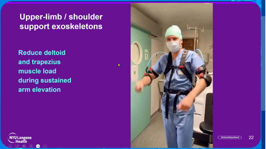 Есть экзоскелеты, позволяющие быстро сесть в любом месте без необходимости катить за собой стул. Некоторые устройства снабжены педалью для переключения между разными источниками энергии. Барьерами для внедрения таких экзоскелетов остаются дороговизна и отсутствие доказательств их эффективности для хирургов-гинекологов.